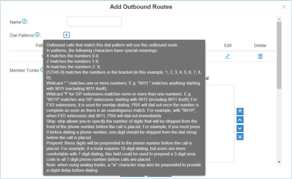 next to Dial Pattern. This pattern is used to match the digits that users dial. When the dialed numbers match a dial pattern, PBX will route the call out through the matched outbound route.